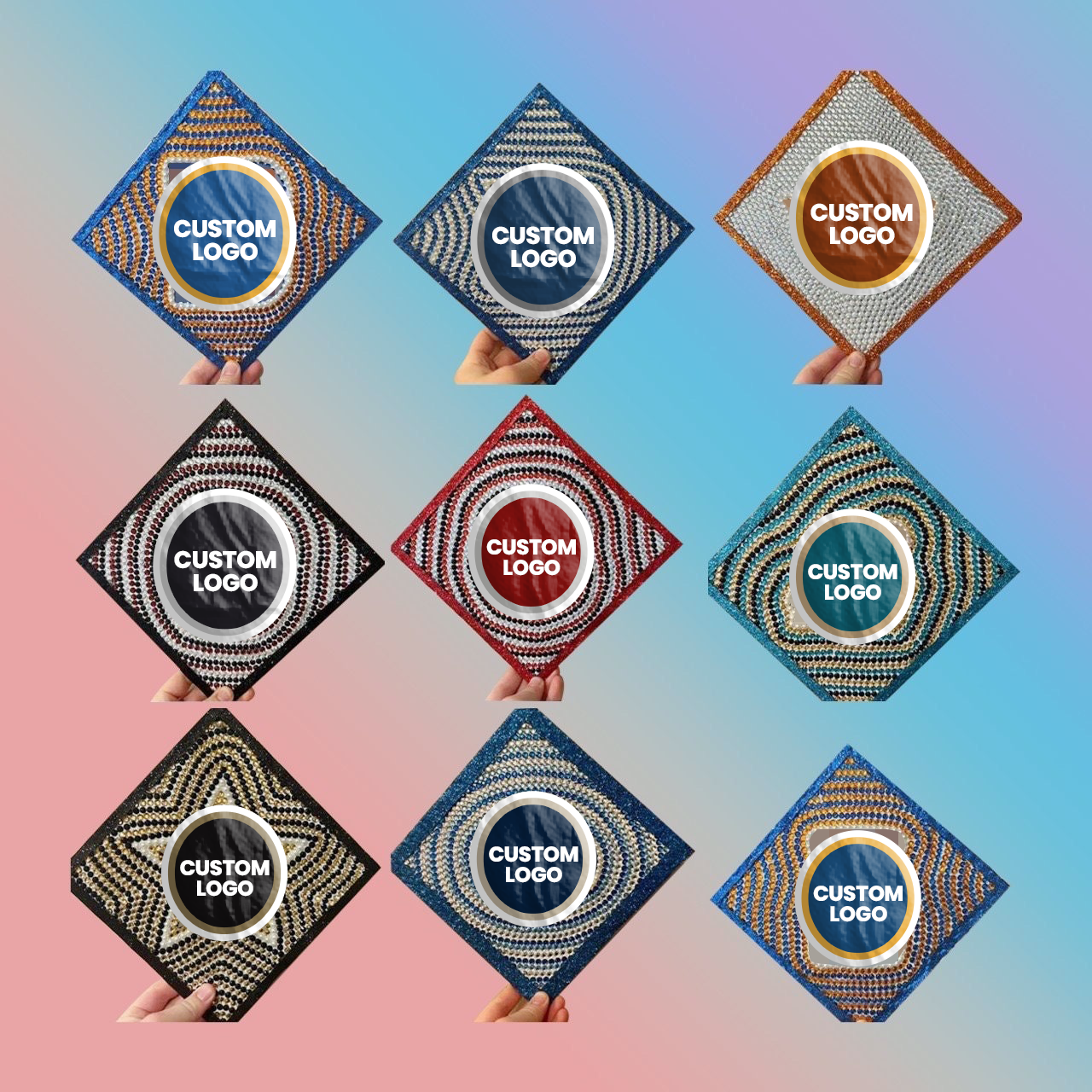 We are so excited to bring back our blinged-out graduation cap toppersš in time for the 2025 graduation season. All of our graduation cap toppers have your college logo placed in the middle of the cap, with a hole (in center) for the tassel to stick out. Each topper is blinged-out around the logo with coordinating colored rhinestones. Then a ribbon will be placed as a boarder on the outside of each cap. All toppers come with 4 velcro adhesives for you to stick on each corner of your grad cap. Please note, these are toppers, we don't need your actual grad cap given out by your school.